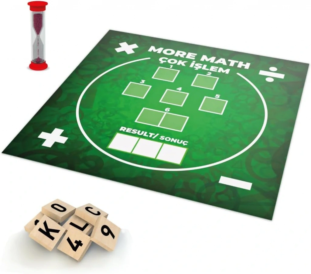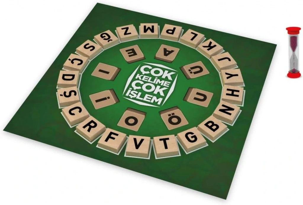 Kutu içeri: 1 adet ahşap oyun tablası 24 adet ahşap üzeri baskılı harf 4 adet defter 4 adet kalem 0 ile 9 arasında rakamlardan oluşan 3 takım ahşap obje üzerine baskılı rakamlar 2 adet bez kese 1 adet Kum saati