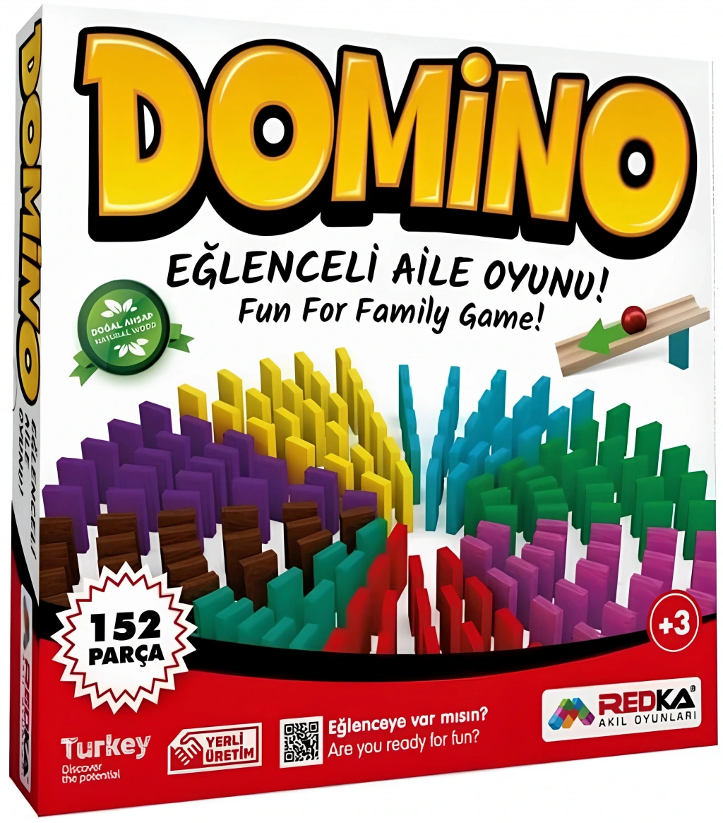 Kutu içeriği: Redka Domino oyunu, 9 farklı renkte 150 parça ahşap domino taşı, 1 adet ahşap köprü ve 1 adet plastik bilye olmak üzere toplam 152 parçadan oluşur.