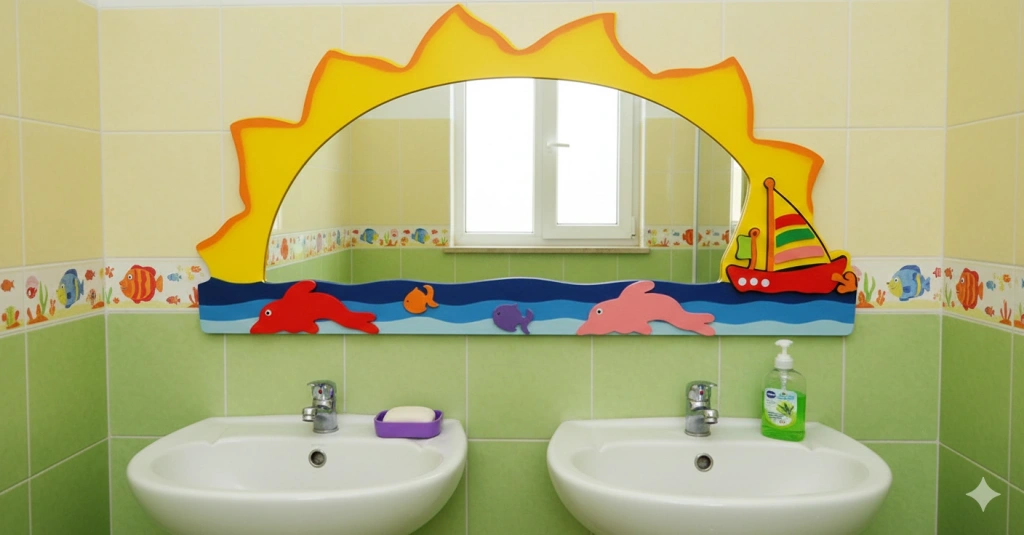 Çocukların günlük hijyen alışkanlıklarını kazanmalarını kolaylaştırmak için tasarlanmış, anaokulu kullanımına uygun bir lavabo aynası.
