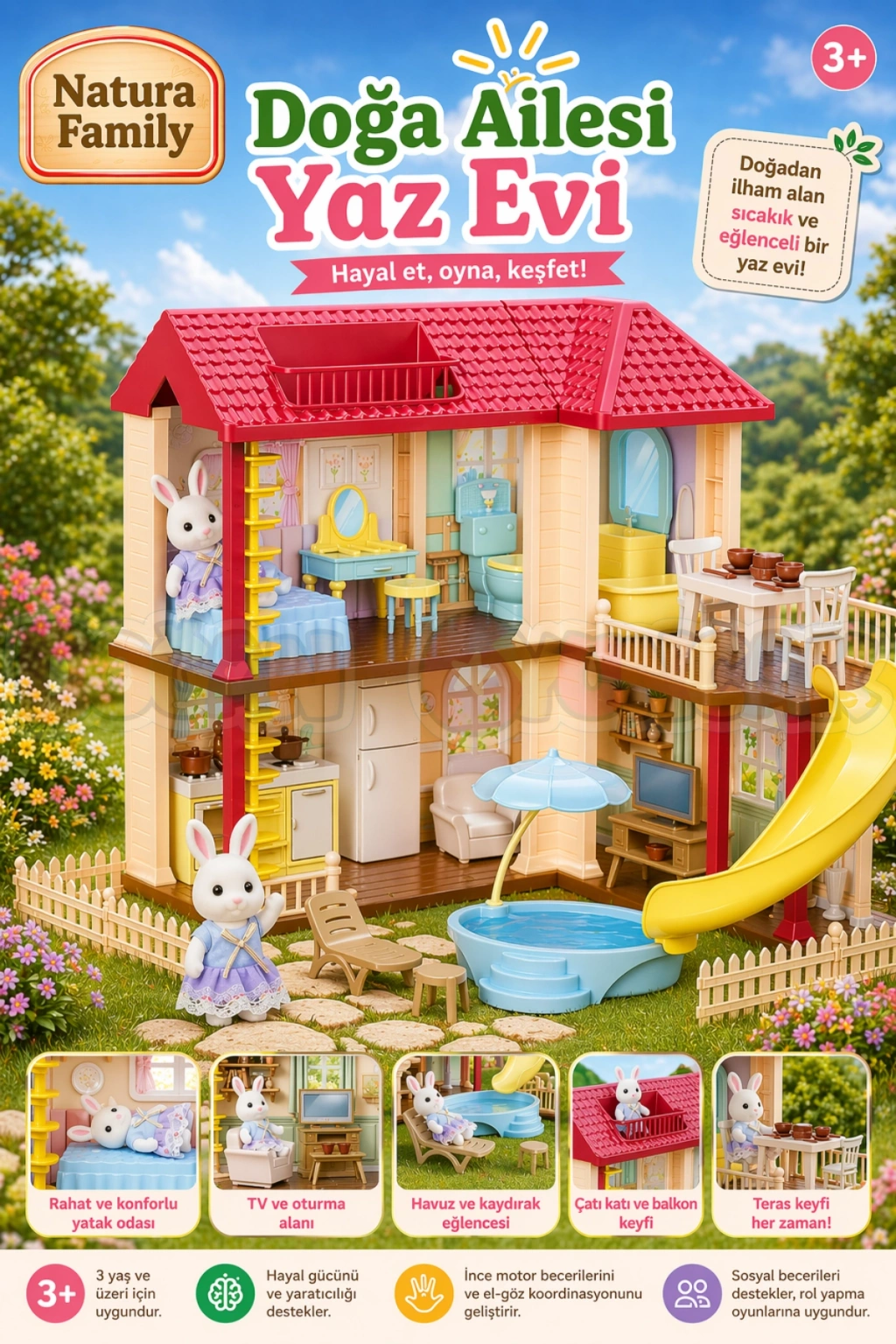 Doğa Ailesi Yaz Evi; detaylı tasarımı, sıcak atmosferi ve zengin oyun alanlarıyla miniklere gerçek bir yaz evi deneyimi sunar.