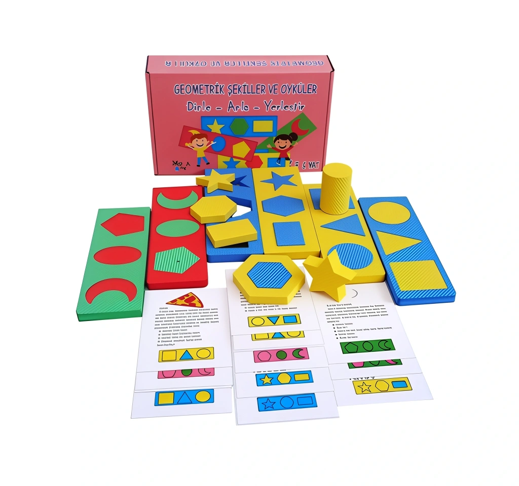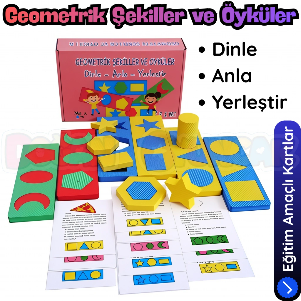 Geometrik Şekiller ve Öyküler seti, çocukların hem hikaye anlama hem de geometrik şekilleri tanıma becerilerini bir arada geliştirmeye yönelik olarak hazırlanmış eğitici bir materyaldir.