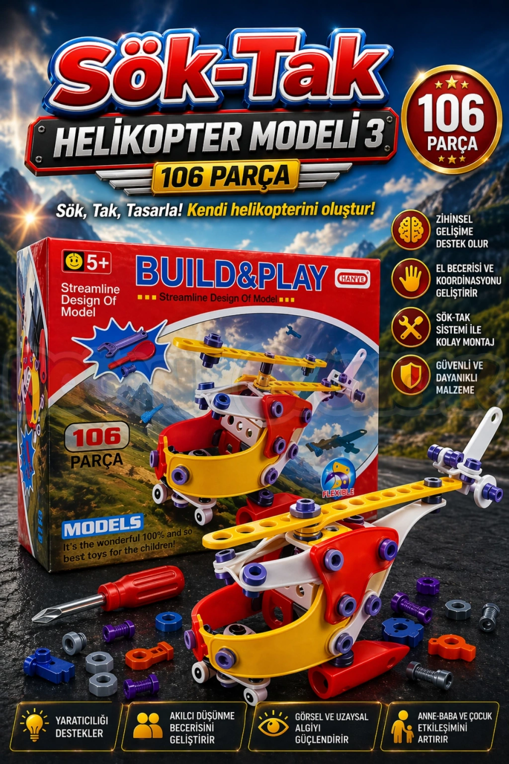 Hem eğitici hem de keyifli bir oyuncak arıyorsanız, Sök-Tak Helikopter 3 Modeli çocuklar için mükemmel bir seçim!
