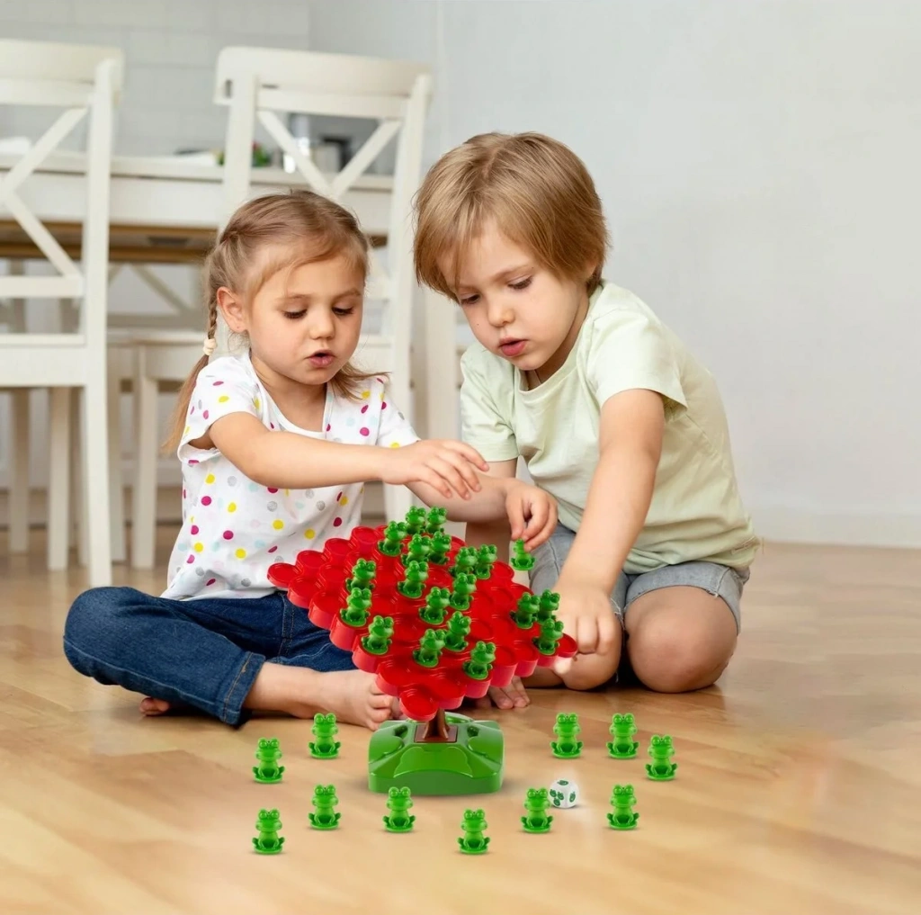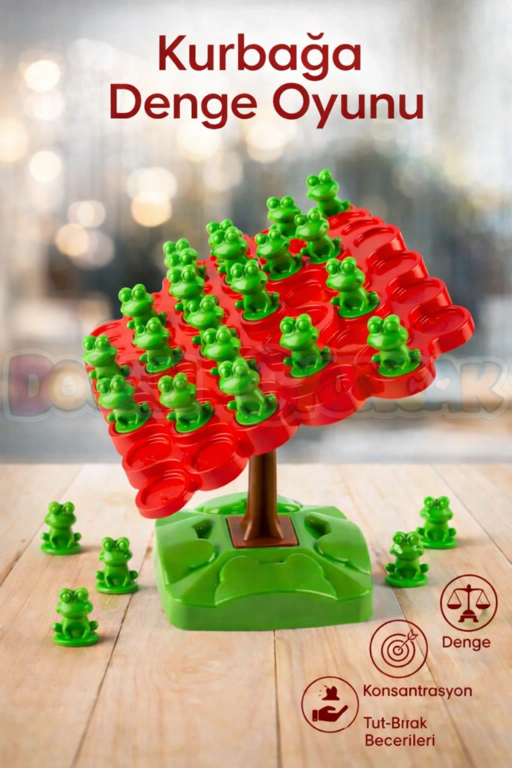 Kurbağa Denge Oyunu çocuklara zar üzerinde bulunan kurbağa adedini denge tablasına yerleştirmek yoluyla matematik becerilerini geliştirir. Kurbağa Denge Oyunu tabla üzerinde kurbağa sayısı arttığında tablayı dengede tutabilmek için çocuklarda hassas hareket etme kabiliyeti, el-göz koordinasyonunu ve motor becerileri geliştirilmesine olanak sağlar.
