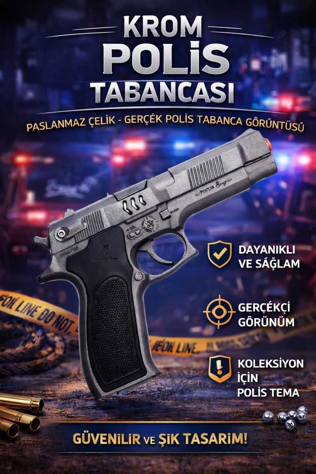 Kovboy ve polis temalı farklı renk ve kaplama seçenekleri sayesinde her zevke hitap eder. Gümüş, siyah ve krom alternatifleri ile hem klasik hem modern tasarım anlayışını bir araya getirir.