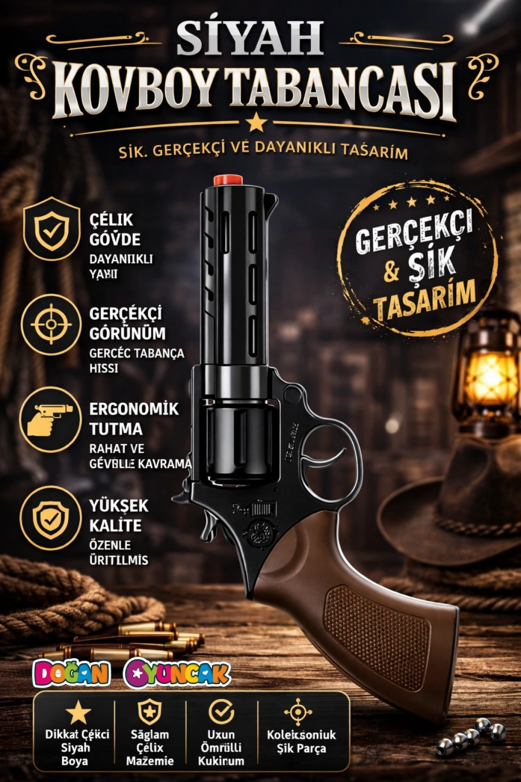 Kovboy ve polis temalı farklı model seçenekleri ile sunulan bu ürün, estetik görünümü ve kaliteli hissiyatı bir arada sunar.
