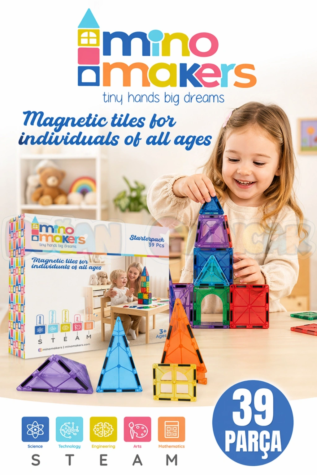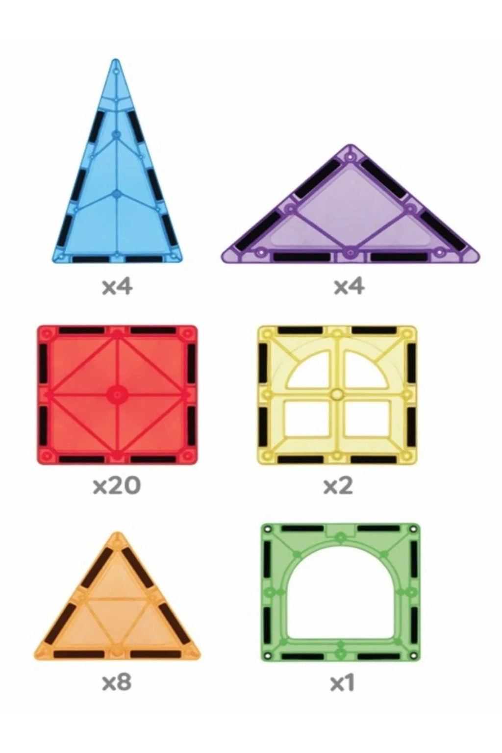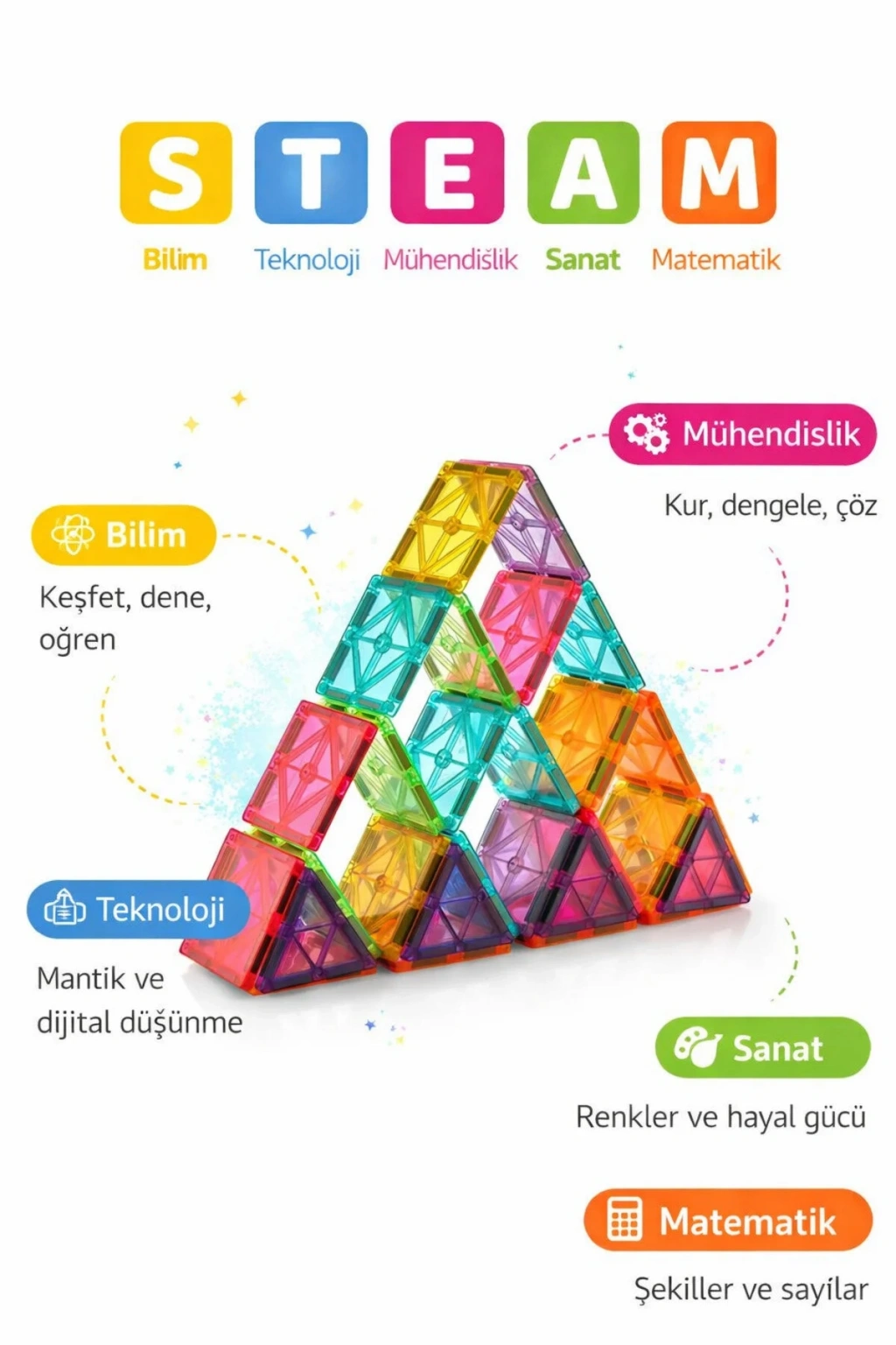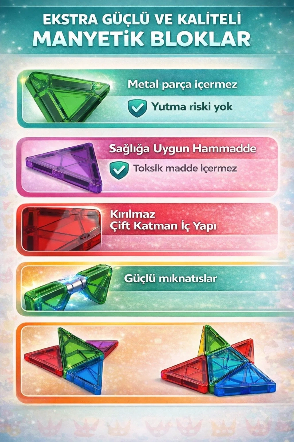 Güçlü Yapılar, Güvenli Oyun Ayrılmayı zorlaştıran sağlam ultrasonik kaynak Darbelere karşı dayanıklılık sağlayan özel iç tasarım Dengeli ve sağlam yapılar için yüksek çekim gücüne sahip mıknatıslar Zararlı madde içermeyen, çocuklara uygun plastik malzeme Farklı setlerle birleşerek daha büyük projeler kurulmasını sağlayan uyumlu parçalar.