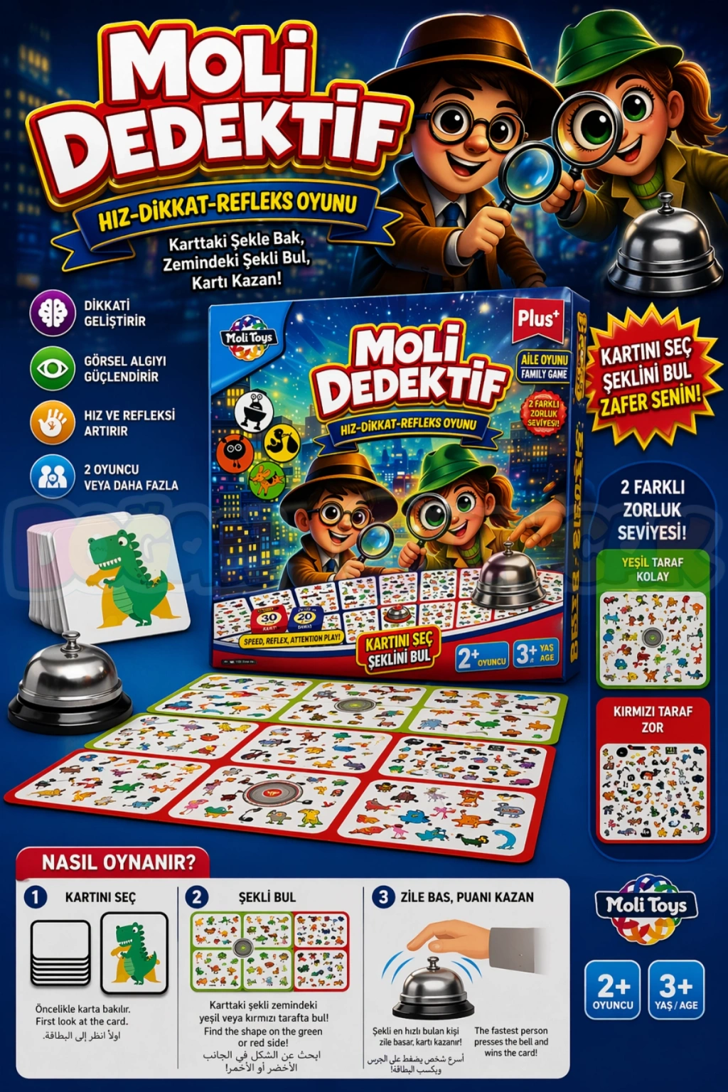 Bu kartlardaki şekillerin tamamı bulunduktan sonra oyuncu zile basar. Karttaki 2 veya 3 şeklin tamamını bulmadan diğer oyunculara herhangi birşey söylenmemelidir.