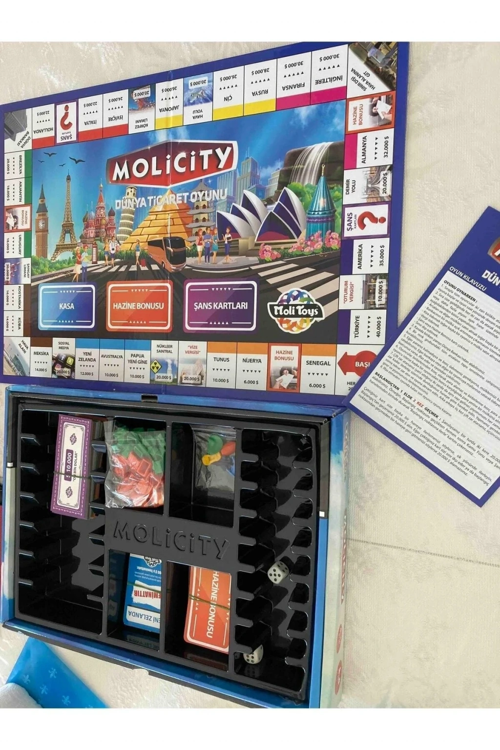 Dünya çapında büyük ilgiyle oynanan emlak ticareti oyunu şimdi Moli Toys kalitesiyle sizlerle. Dünya ülkeleriyle birlikte büyük yatırımlar yaparak ticaretin ve rekabetin o eşsiz heyecanına ortak olun.