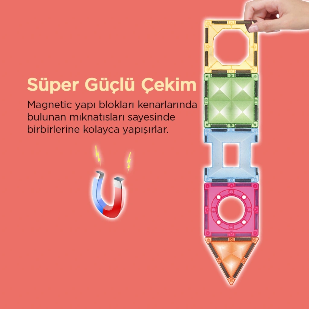 Dayanıklı malzemeden üretilen bu set, güçlü mıknatısları sayesinde kolayca birleşiyor ve çocukların diledikleri yapıları güvenle inşa edebilmelerine olanak tanıyor.