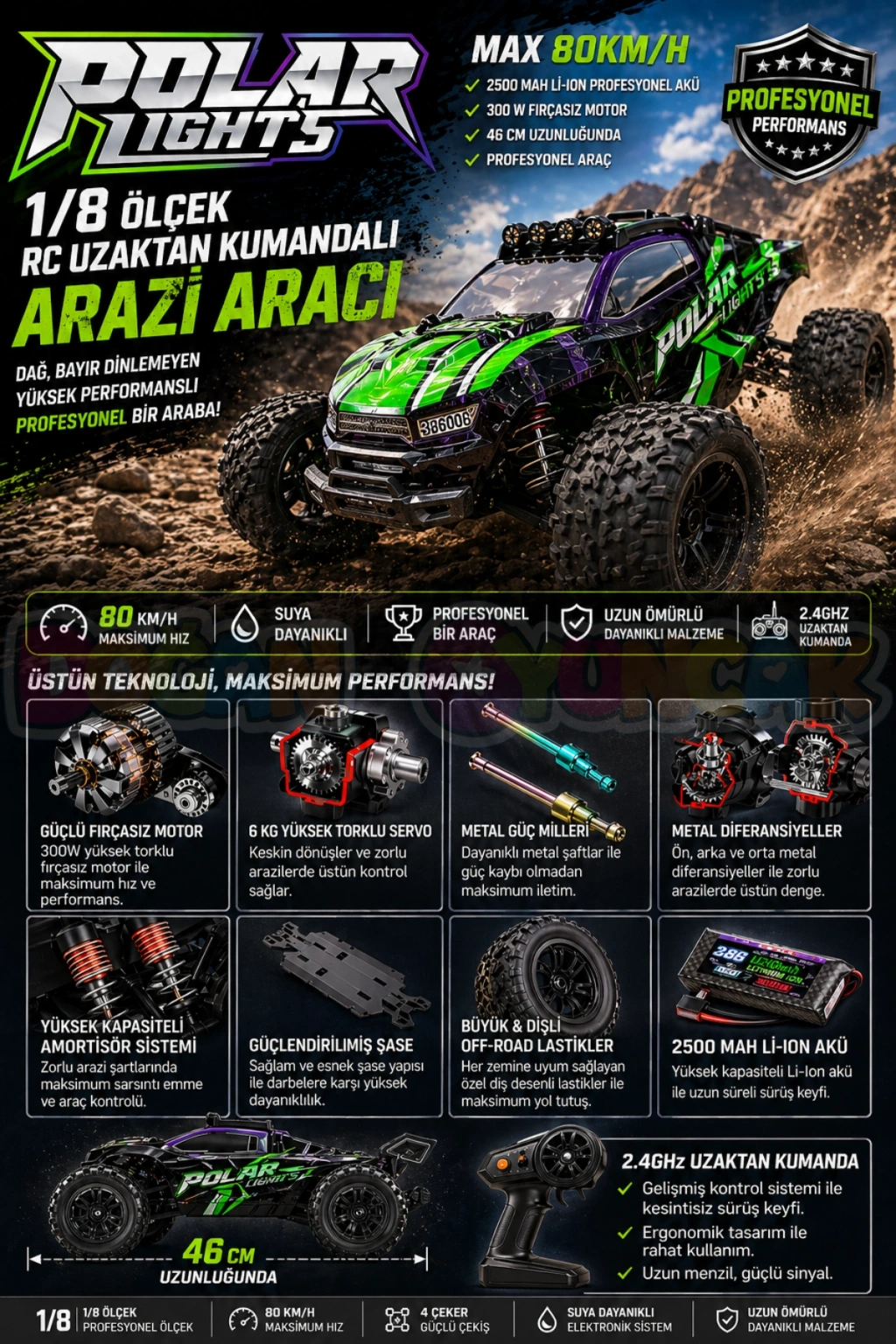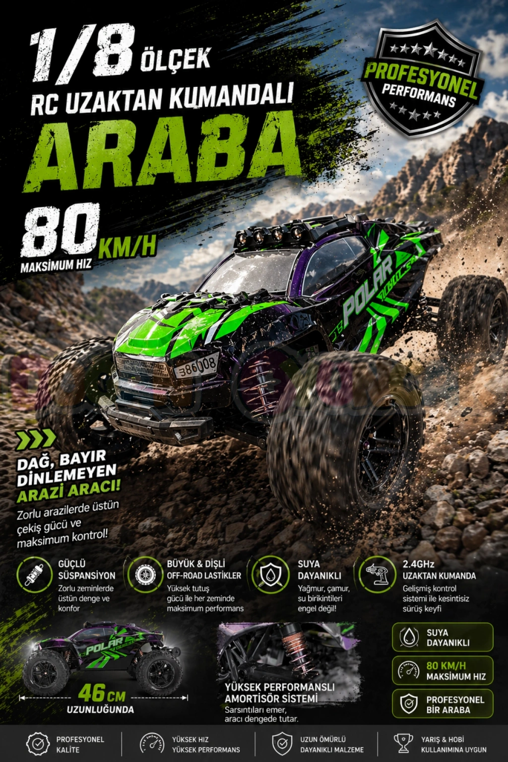 80 km/s hıza ulaşabilen bu model, sadece bir oyuncak değil; gerçek bir off-road deneyimi sunar.