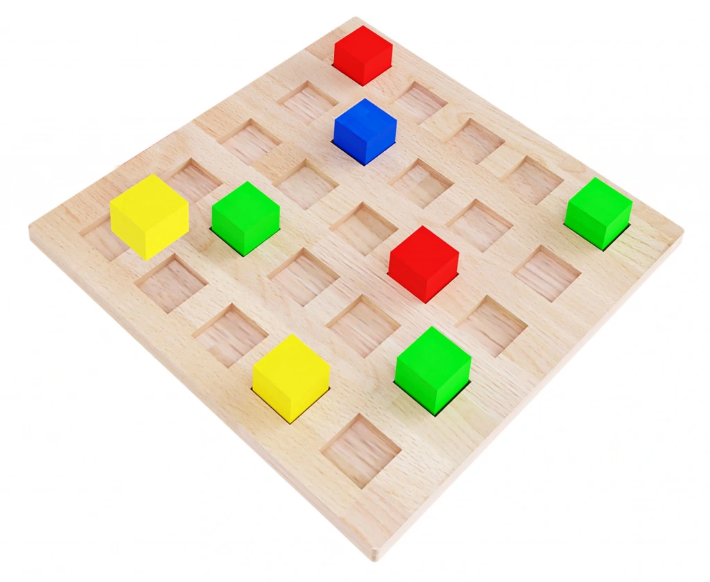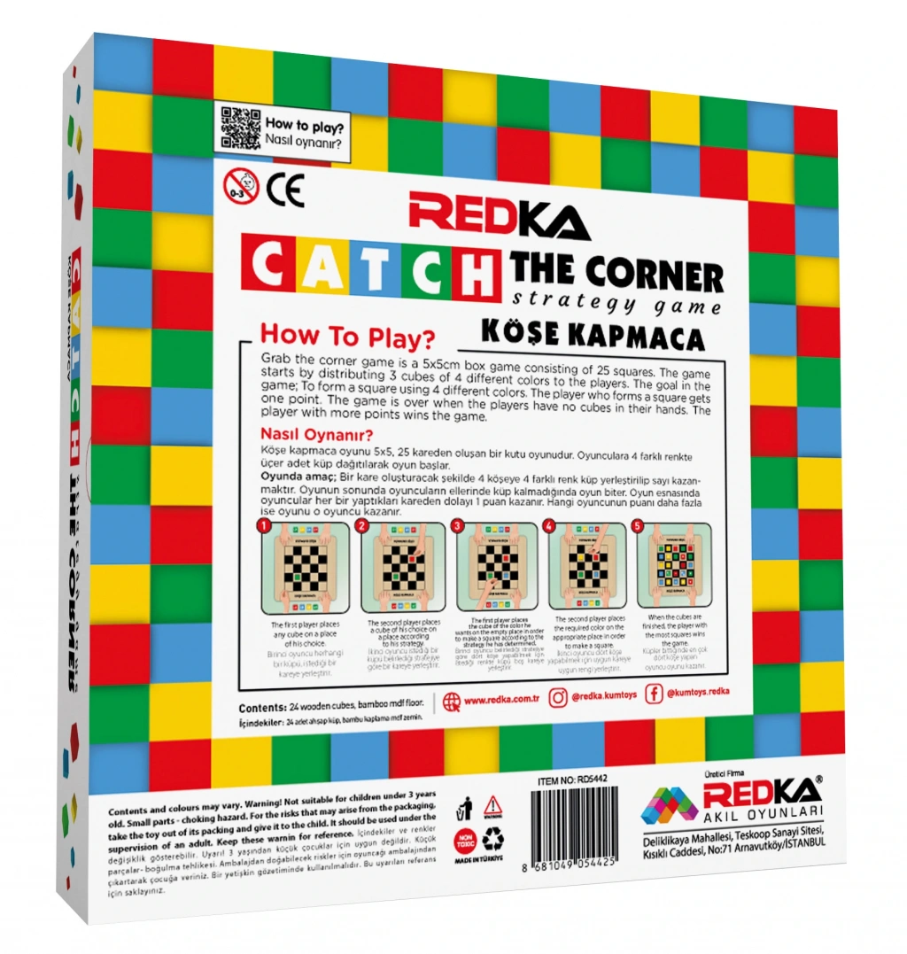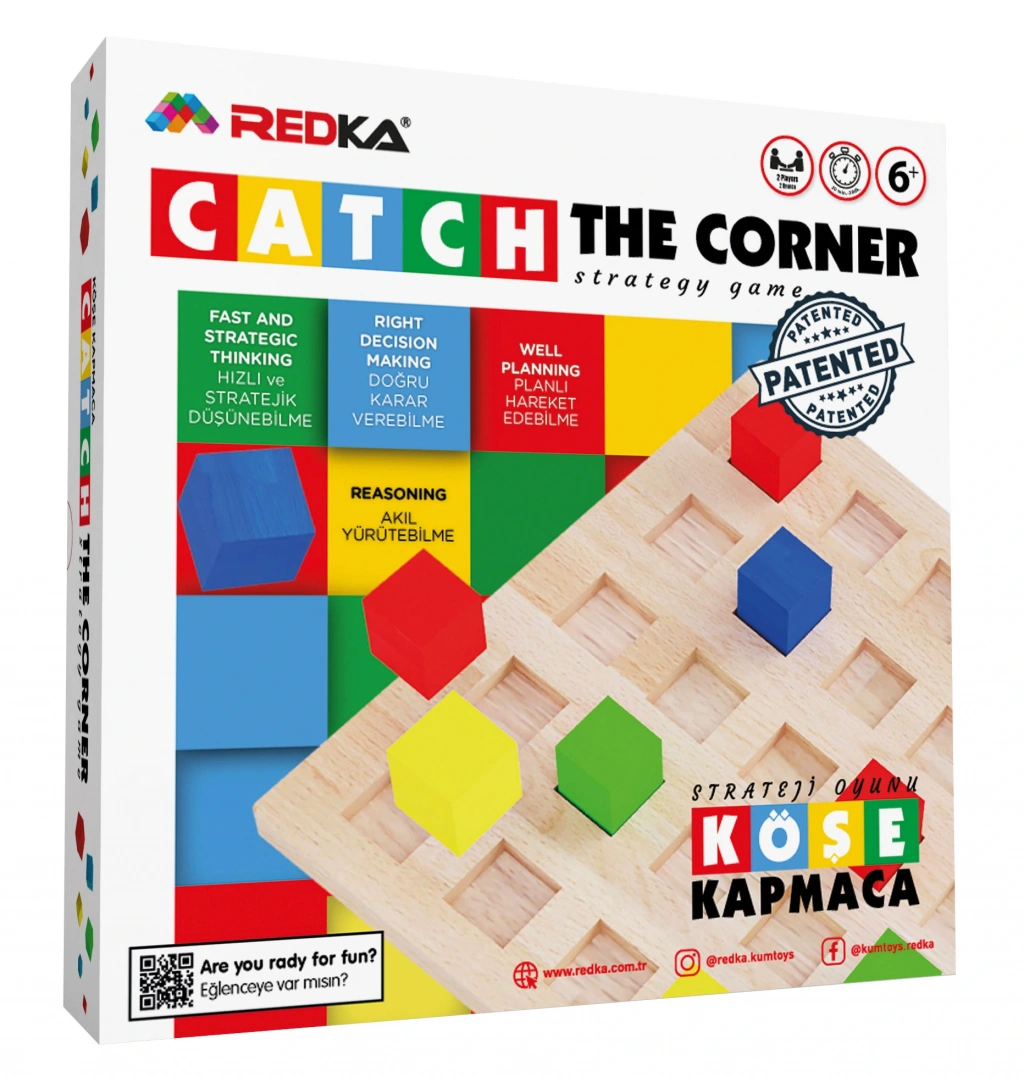 Redka Köşe Kapmaca Akıl Zeka ve Strateji Oyunu Köşe kapmaca oyunu ahşap zemin üzerine çizilmiş 5x5, 25 kare ve 24 adet ahşap renkli küpten oluşan bir kutu oyunudur.